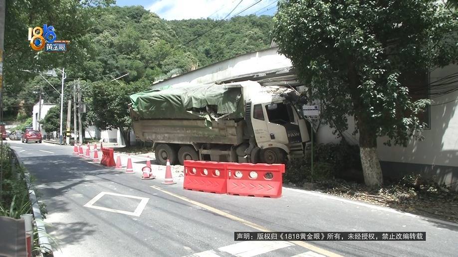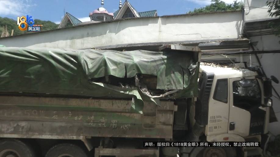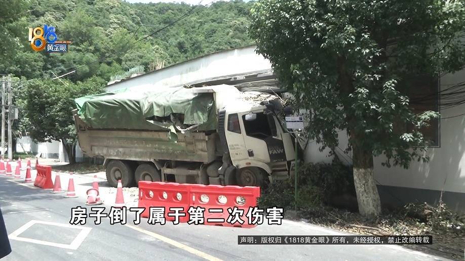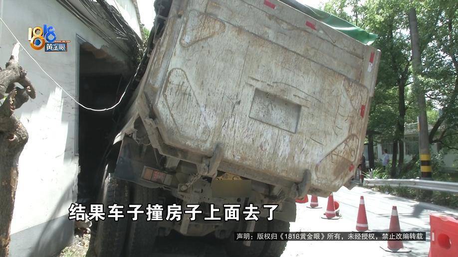 这是叶大伯家外围的监控画面,13号凌晨0点03分左右,第一辆渣土车经过叶大伯家,紧接着,第二辆渣土车出现在监控中车辆没往右打方向,踩了一脚刹车就消失在监控中,叶大伯说监控有死角,当时车辆撞进了他家的辅房,现场渣土车左侧撞进了叶大伯家的房子,车顶卡在屋顶往外侧倾斜,驾驶室变形严重。